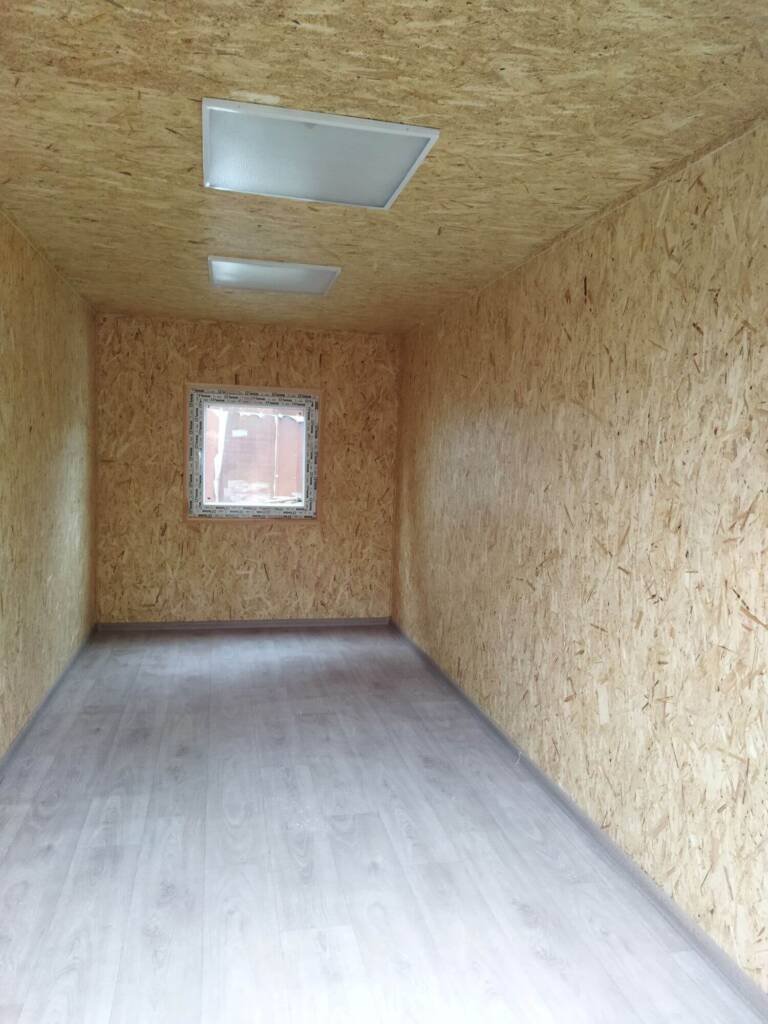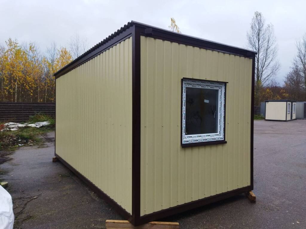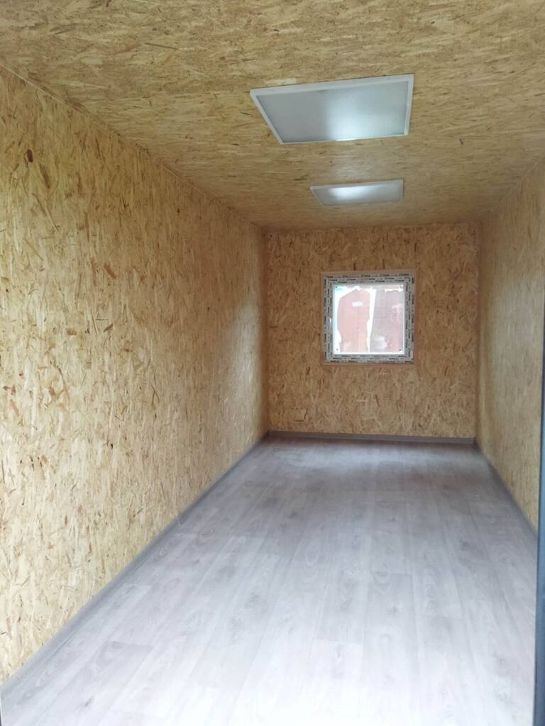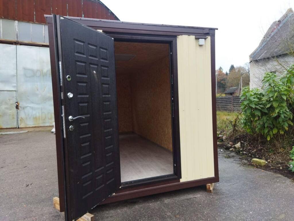 Kaina€5203.00 su PVMIšorės matmenys:4.94×2.35×2.4 (ilgis x plotis x aukštis)Išorės apsiuvimas:Dengtas profiliuota cinkuota skarda 0,45mm ral pieno spalvos ( sienos), stogas rudas. Dugno apsauga, cinkuota profiliuota skarda 0.45mmApšiltinimas:100mm mineralinė vata (sienos,lubos, grindys)Grindys:18 mm osb plokštė, PVC danga ne plonesnė nei 2mmSienos:MDF panelės apdaila, medžio imitacija su raštu.Lubos:PVC lentelės baltosKita:1 baltas varstomas langas 900×900 mm Durys.El. instaliacija:Šviestuvai, rozetės, jungikliaiShare